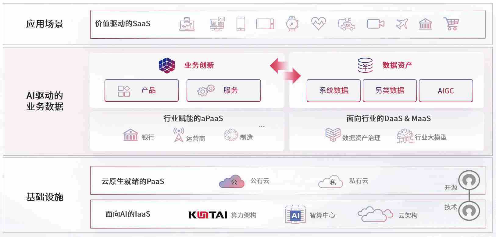 数字时代,,围绕企业数字化转型的关键要素,,,3499拉斯维加斯数码开创性的提出数云融合战略和技术体系框架,,,,着力在云原生、、数字原生、、、AI原生和信创产业上架构产品和服务能力,,为处在不同数字化转型阶段的快消零售、、、、汽车、、、、金融、、、、医疗、、政企、、、、教育、、、、运营商等行业客户提供泛在的敏捷IT能力和融合的数据驱动能力,,,,构建跨界融合创新的数字业务场景和新业务模式,,助力企业级客户建立面向未来的核心能力和竞争优势,,,全面推动社会的数字化、、、智能化转型升级。。