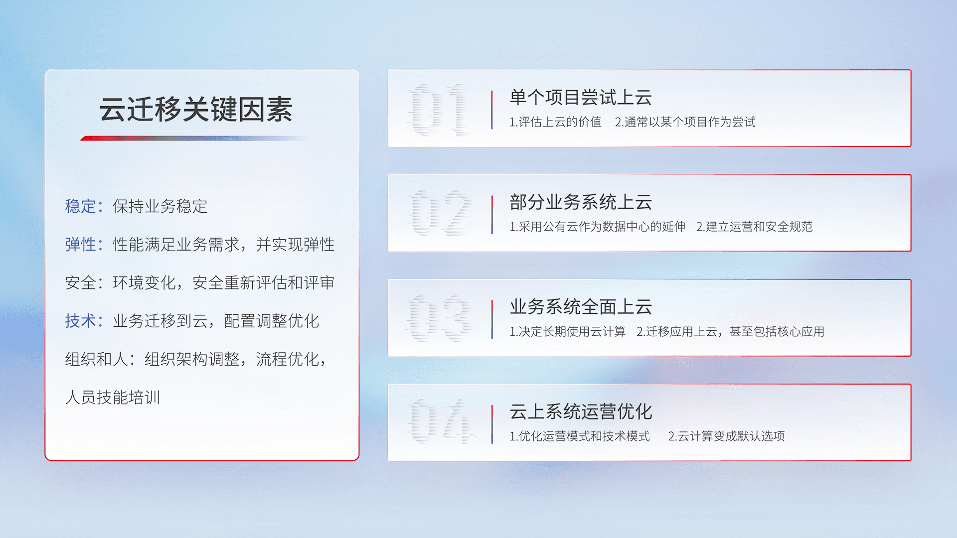 结合实际业务,,,从规划设计、、、云平台选型、、云原生改造、、数据迁移、、、、集成交付,,,,迁移全过程为客户识别最佳上云路径,,,做好风险识别管理,,,设计网络架构、、、身份权限、、、安全审计合规、、操作审计、、、、日志审计、、、监控告警策略、、多站点容灾设计等,,,对云上基础设施进行整体规划,,,,提升IT治理水平,,,,以满足弹性、、、、高可用、、、、高性能的需求。。。