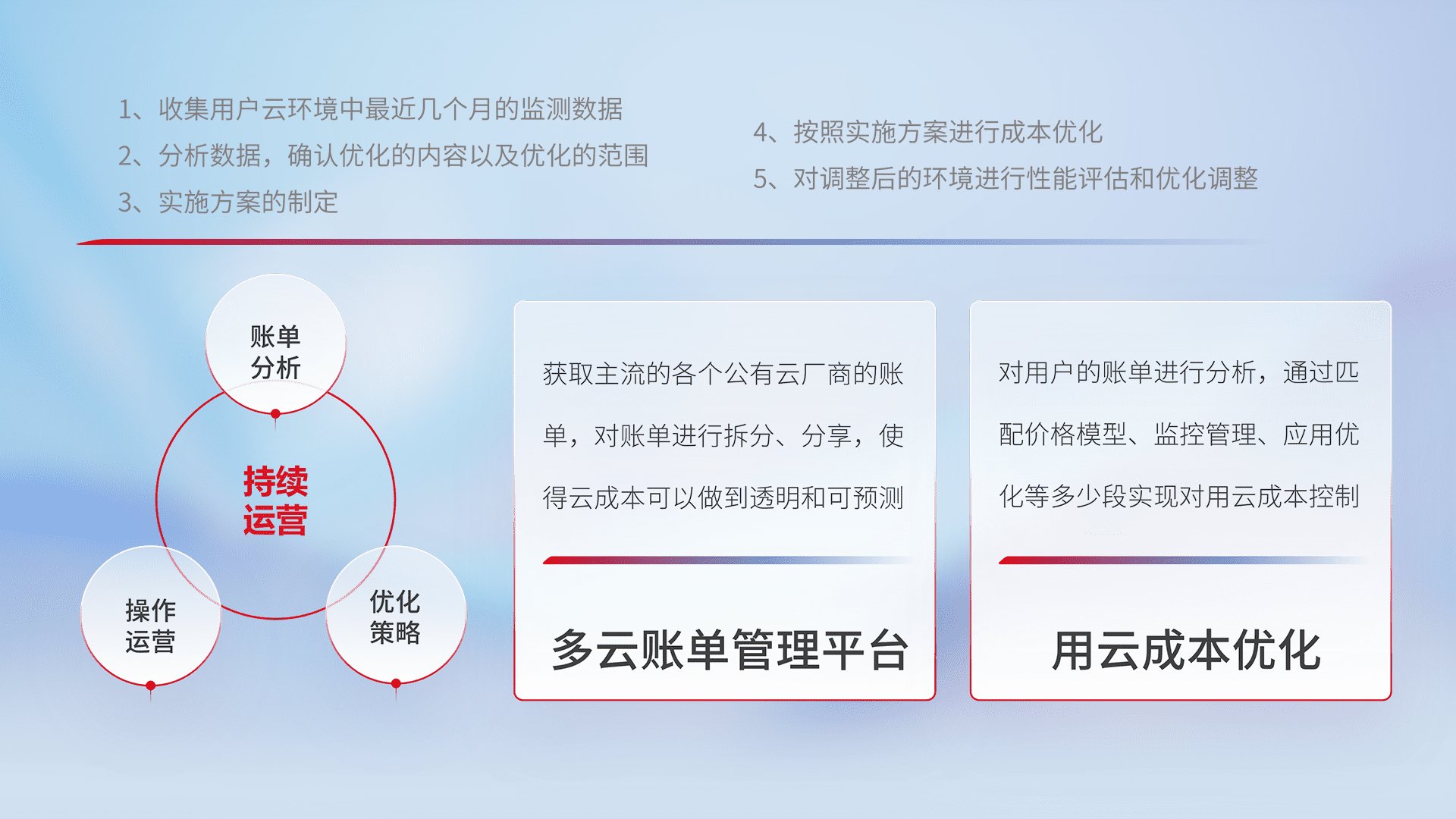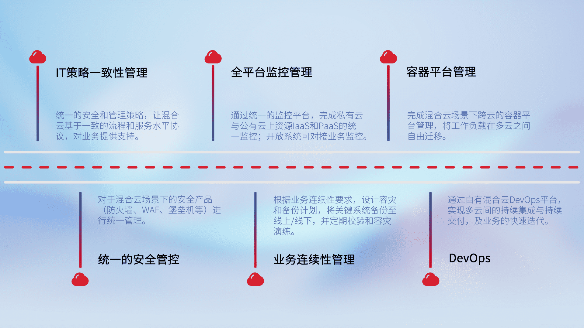 通过多云纳管,,,,以统一的资源数据模型把客户的云资源进行抽象和封装,,,进而实现对多云资源的统一操作,,,,保障云资源管理的可靠性、、、、稳定性与可用性。。。量身定制化运维内容,,,,配置、、、开发运维、、、、补丁管理、、、备份、、、、监控、、、、认证和访问管理、、、审计和日常巡检等,,保障在用云过程中的可靠度,,,稳定度以及高可用率。。。