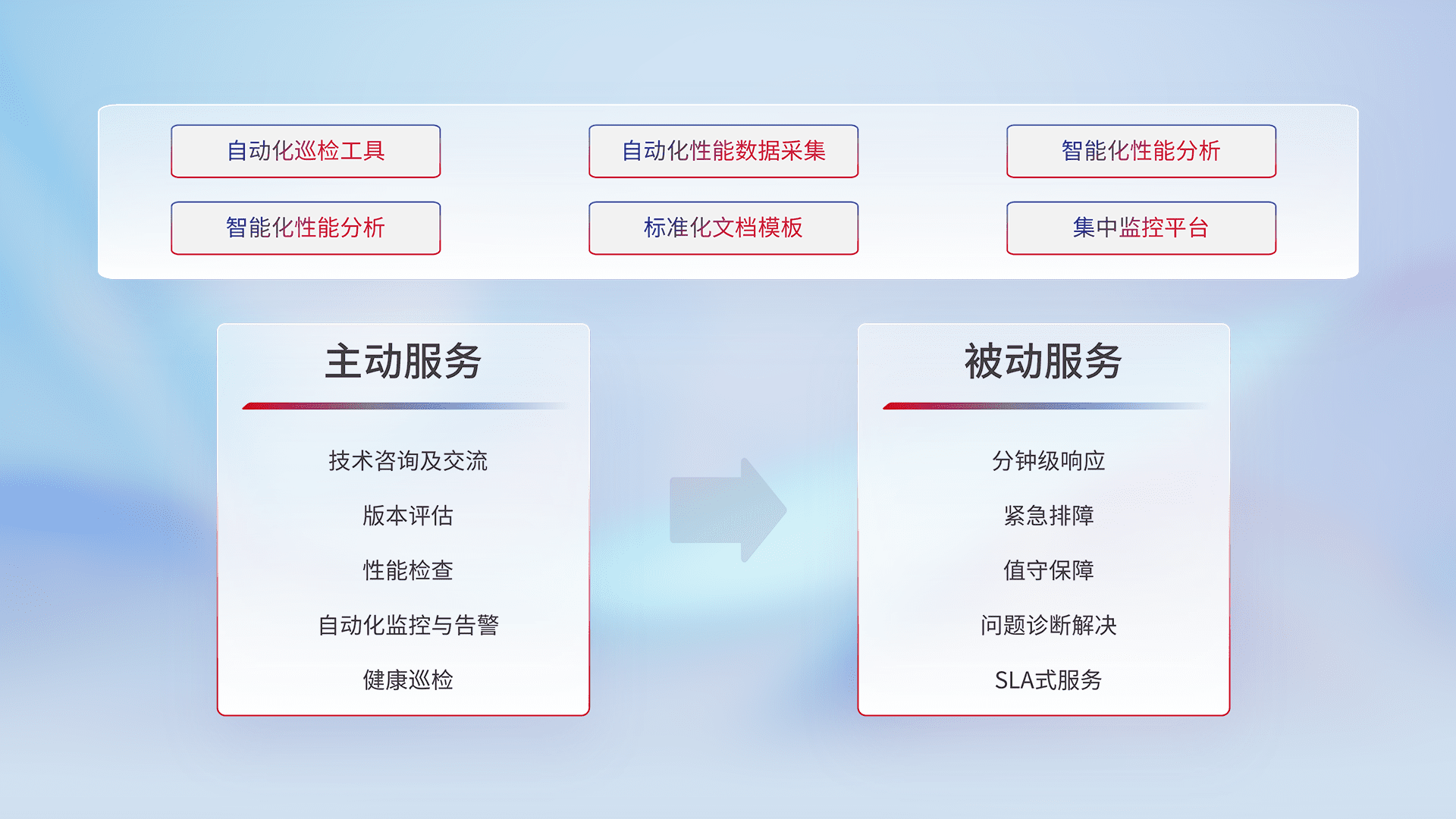 智能化工具和标准化文档,,保障服务质量,,,提供主动服务(包含技术咨询、、、、版本评估、、性能检查、、、自动化监控与告警、、、、健康巡检)和被动服务包含(分钟级响应、、、紧急排障、、、值守保障、、、、问题诊断解决、、、SLA服务)。。